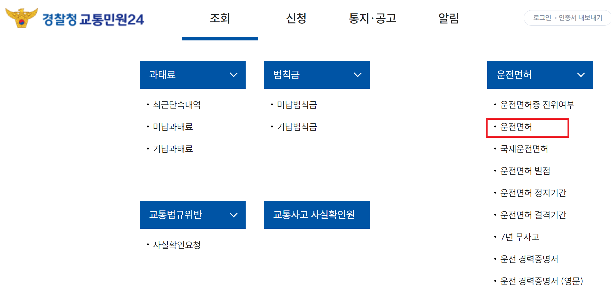위 버튼 클릭 후 운전면허증 갱신기간을 조회하기 위해서 조회 ▶ 운전면허 를 클릭 후 로그인해주면 간편하게 조회할 수 있습니다.